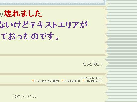 これまではコメントのタイトルと日付だけでしたが コメントを下さった方のお名前が表示されるようになりました:.゚ヽ(´∀`。)ノ゚.:。゚ トラックバックも同様の設定をしました。 …………………………………地味………………………… やってみるとできるもんだなあ。 これを期にキーボードでの範囲選択も使うようになったし。 ただ 変更後はテキストエリアのhtml表示が消えるので 変更後さらに変更はできません。一発勝負!(うそ) そのときは削除してから再度プラグインを追加しなおして htmlを書き直す必要があります。 こんなのってわしだけなの??(´・・?) Blog内検索のボタン設定したときはなんともなかったし 鯖が重い時間だったりそうゆう事情で起こることかもしれない。 まあ いずれにしろめんどうです。 チャレンジャーと呼んでくださって結構ですわよ をほほほほほほほほほ!